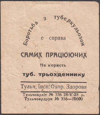1928 г. 28.05.1928 г. Разм. 53 х 60 мм. Одноцветная печать на тонкой белой бумаге. В центре текст в две строки на украинском языке: «В пользу туб[еркулезного]. трехдневника». Сверху текст в три строки на украинском языке: «Борьба с туберкулезом – есть дело самих трудящихся». Внизу между двумя горизонтальными чертами текст на украинском языке: «Тульчин[ская]. Инсп[екция]. Охр[аны]. Здоровья». Внизу мелким шрифтом выходные данные в две строки на украинском языке: «Тульчоблит №33 28-м-28 г. Тульчпечать №336-10000».