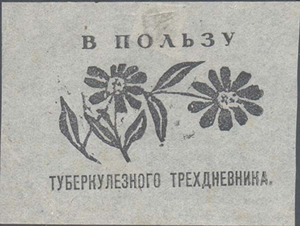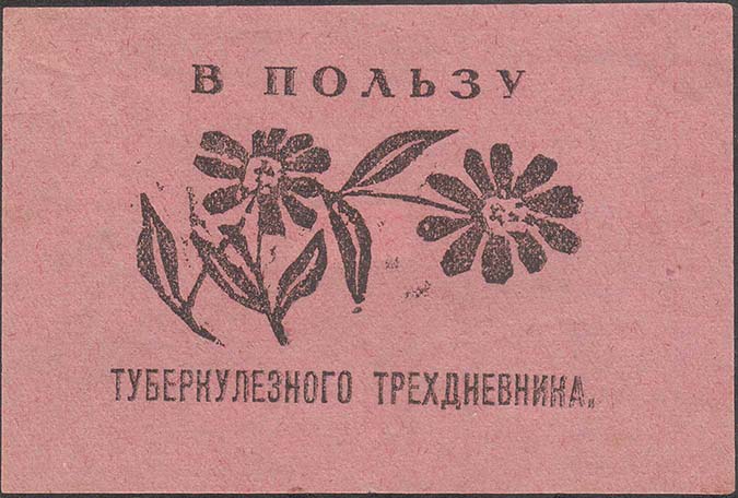 1925(?) г. Разм. 85 х 56 мм. Одноцветная печать на бумаге различных цветов. В центре стилизованное изображение двух ромашек. Сверху текст: «В пользу». Внизу продолжение текста: «Туберкулезного трехдневника».