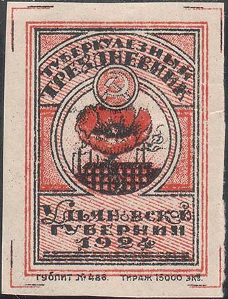 1924 г. Разм. 42 х 55 мм. Двухцветная печать на белой бумаге. В центре в четверной прямоугольной рамке разм. 33 х 46 мм круглая рамка. В круглой рамке на фоне индустриального пейзажа серп и молот и цветок мака. Сверху полукругом текст в две строки: «Туберкулезный трех-дневник». Внизу текст в три строки: «Улья-новской губернии 1924». Внизу мелким шрифтом выходные данные: «Гублит №486. Тираж 15000 экз.». По углам разграничительные линии.
