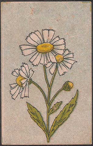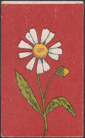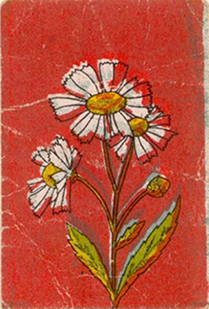 1925(?) г. Разм. 37 х 61 мм. Многоцветная печать на толстой желтоватой бумаге. На сплошном фоне цветы ромашки.