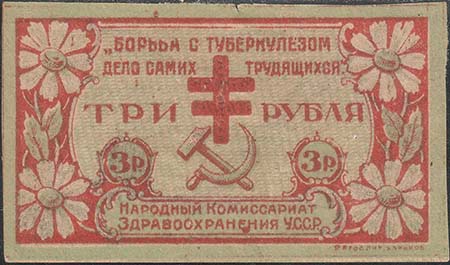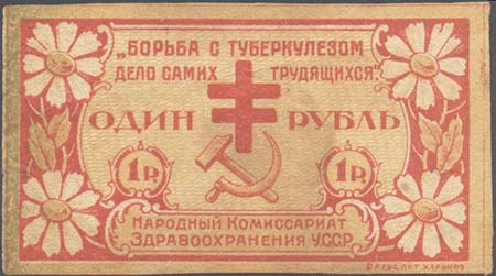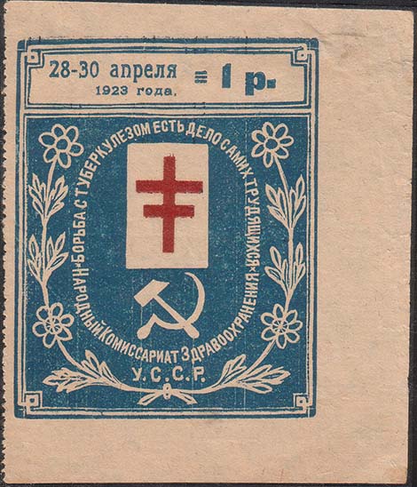 1923 г. Разм. 68 х 37 мм. Двухцветная печать на желтоватой бумаге. В декоративной рамке в центре Лотарингский крест и серп с молотом. Сверху текст в две строки: ««Борьба с туберкулезом есть дело самих трудящихся»». Внизу слева и справа номинал в круглых рамках. Внизу в декоративной рамке текст в две строки: «Народный Комиссариат Здравоохранения У.С.С.Р.». Слева и справа цветы ромашки. Справа внизу под рамкой мелким шрифтом выходные данные: «2-я Гос. Лит. Харьков».