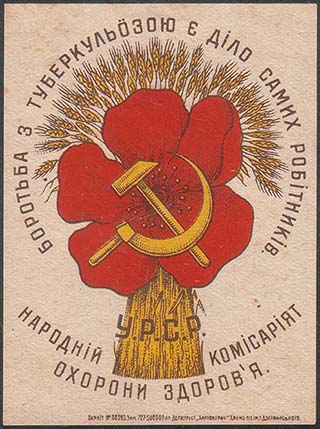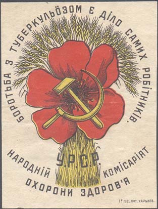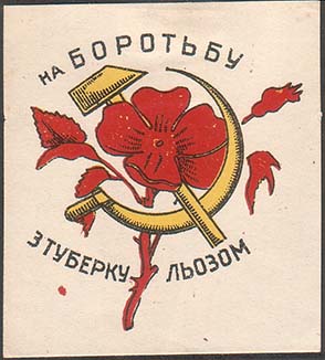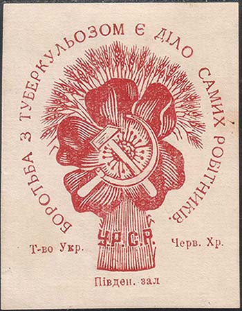 1930(?) г. Разм. 45 х 56 мм. Двухцветная печать на белой бумаге. В центре серп и молот и цветок мака. Сверху полукругом текст на украинском языке: «На борьбу». Внизу полукругом продолжение текста на украинском языке: «С туберкулезом». Слева вертикально снизу вверх мелким шрифтом выходные данные на украинском языке: «Окрлит. №. 07355. Зак. 492. 200.000. Трест «Харьковполиграф». Хромо-лит им. Т. Дзержинского».