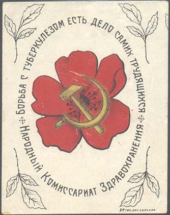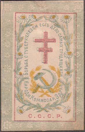 1928(?) г. Разм. 70 х 92 мм. Многоцветная печать на белой бумаге. В прямоугольной рамке разм. 36 х 63 мм с декоративными полями в обрамлении венка из ромашек Лотарингский крест. Внизу серп и молот в обрамлении венка из колосьев пшеницы. По внутреннему периметру венка из ромашек текст: «Борьба с туберкулезом есть дело самих трудящихся. Народн[ый]. Комиссар[иат]. Здрав[охранения].». Внизу аббревиатура «С.С.С.Р.».