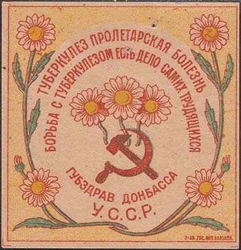 1930(?) г. Разм. рамки 58 х 59 мм. Трехцветная печать на желтоватой бумаге. В центре в обрамлении венка из цветов ромашки серп и молот и три цветка ромашки. Сверху полукругом текст в две строки: «Туберкулез пролетарская болезнь. Борьба с туберкулезом есть дело самих трудящихся». Внизу полукругом текст в две строки: «Губздрав донбасса. У.С.С.Р.». В правом нижнем углу выходные данные мелким шрифтом: «2-я Гос. Лит. Харьков».
