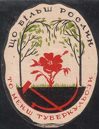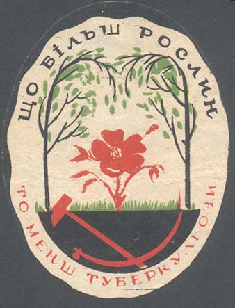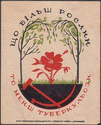1930 г. Трехцветная печать на кремовой бумаге. В центре в стилизованной рамке из деревьев цветок мака и трава. Внизу скрещенные серп и молот. Сверху полукругом текст на украинском языке: «Чем больше растений». Внизу продолжение текста: «Тем меньше туберкулеза». Внизу мелким шрифтом выходные данные на украинском языке: «Окрлит. №1990. Зак. №4600-2000000 Гострест «Харполиграф». Хромилит. Им. Дзержинского».