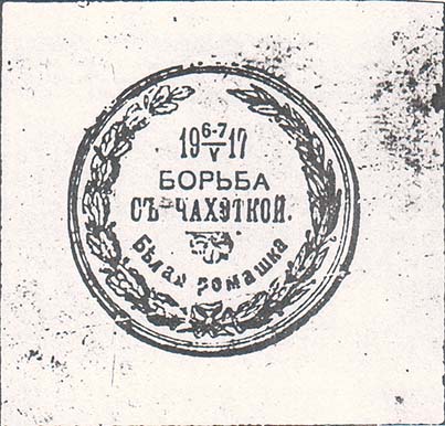 1917 г. 06.-07.05.1917 г. 07.05.1917 г.). Разм. 68 х 68 мм. Одноцветная печать на бумаге различных цветов. В центре в тройной круглой рамке диаметром 44 мм в обрамлении венка в центре текст в три строки: «19 6-7/V 17 Борьба с чахоткой». Ниже декоративный элемент и текст: «Белая ромашка».