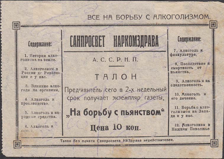 1934 г. Квитанция разм. 130 х 90 мм. Одноцветная печать на тонкой светло-серой бумаге. Левосторонняя зубц. 11 1/2. В тройной прямоугольной декоративной рамке разм. 115 х 79 мм в центре текст в семь строк: «Санпросвет Наркомздрава А.С.С.Р.Н.П. Талон. Предъявитель сего в 2-х недельный срок получает экземпляр газеты «На борьбу с пьянством». Цена 10 к. Слева и справа краткое содержание газеты». Сверху справа над рамкой текст: «Все на борьбу с алкоголизмом». Внизу с внутренней стороны рамки текст: «Талон без печати Санпросовета Наркомздрава недействителен».
