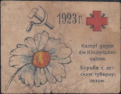 1923 г. Разм. 71 х 54 мм. Многоцветная печать на светло-желтой бумаге. В центре слева цветок ромашки. Справа текст в три строки на немецком и русском языках: «Борьба с детским туберкулезом». Сверху дата: «1923 г.», серп и молот и красный крест.