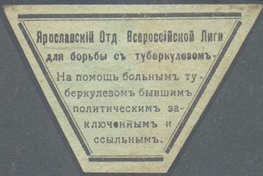 1917(?) г. Виньетка в форме перевернутой трапеции разм. 63 х 41 мм. Одноцветная печать на серо-зеленоватой бумаге. В двойной рамке в форме перевернутой трапеции разм. 54 х 35,5 мм текст в семь строк: «Ярославский Отд[ел]. Всероссийской Лиги для борьбы с туберкулезом. На помощь больным туберкулезом бывшим политическим заключенным и ссыльным».