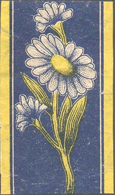 1915(?) г. Разм 32 х 52 мм. Многоцветная печать на белой бумаге. В центре два цветка ромашки с бутонами.