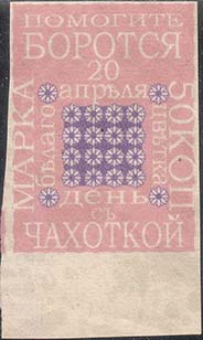 1917(?) г. Разм. рис. 28 х 38 мм. Двухцветная печать на белой бумаге. В центре на сплошном фоне геометрический орнамент из стилизованных цветков ромашки. По наружному периметру орнамента текст: «20 апреля день Белого Цветка». Сверху текст в две строки: «Помогите бороться». Внизу продолжение текста в две строки: «С чахоткой». Слева вертикально текст: «Марка». Справа вертикально номинал: «50 коп.».