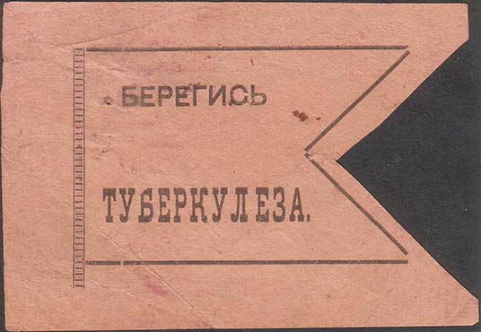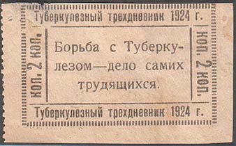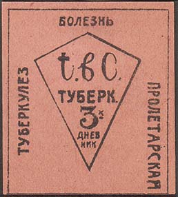 1924 г. Листок из квитанционной книжки разм. рамки 40 х 29 мм. Одноцветная печать на желтоватой бумаге. Левосторонняя нерегулярная зубц. В двойной прямоугольной рамке текст в три строки: «Борьба с Туберкулезом – дело самих трудящихся». Сверху и снизу между рамками текст: «Туберкулезный трехдневник 1924 г.». Слева и справа между рамками номинал.