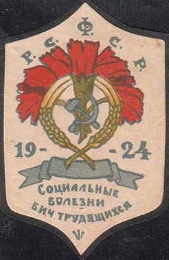 1924 г. Виньетка в виде щитка сложной формы разм. 40 х 62 мм. Трехцветная печать на толстой белой бумаге. В центре серп и молот в обрамлении венка из гвоздик и колосьев пшеницы. Внизу лента и дата: «1924». Сверху аббревиатура «Р.С.Ф.С.Р.». Внизу текст в три строки: «Социальные болезни - бич трудящихся». Внизу декоративный элемент.