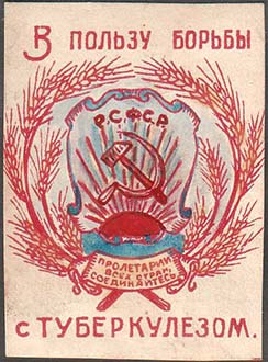 1924 г. Разм. 45 х 54 мм. Трехцветная печать на толстой белой бумаге. В центре герб РСФСР. Сверху текст: «В пользу борьбы». Внизу продолжение теста: «С туберкулезом».