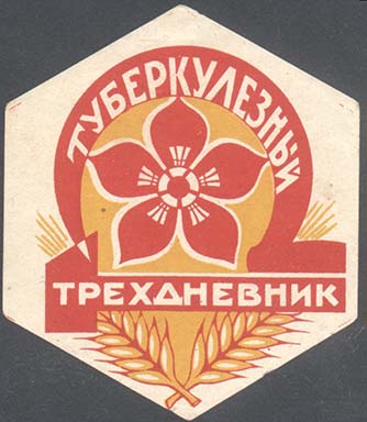 1926 г. Виньетка в виде шестиугольника разм. 55 х 65 мм. Двухцветная печать на белой бумаге. В центре стилизованное изображение цветка мака и серпа и молота. Внизу два колоса ржи. Текст: «Туберкулезный трехдневник».
