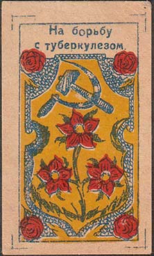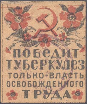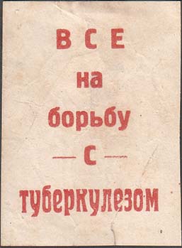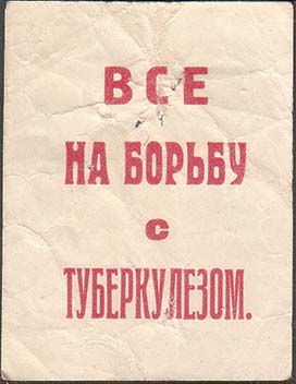 1930(?) г. Разм. 48 х 58 мм. Двухцветная печать на тол-стой рыхлой желтоватой бумаге. Сверху серп и молот в обрамлении венка из цветов мака. Внизу текст в пять строк: «Победит туберкулез только власть освобожденного труда». Внизу по углам цветы мака. Внизу мелким шрифтом выходные данные неразборчиво. На лицевой стороне фиолетовый оттиск круглой печати с неразборчивым текстом.