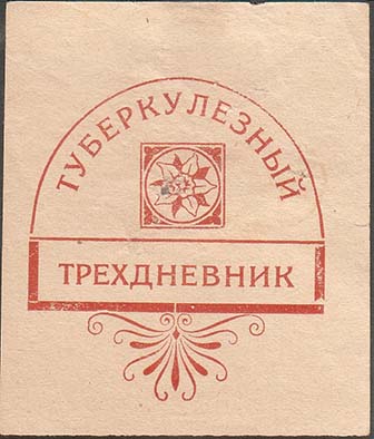1925(?) г. Разм. 58 х 74 мм. Одноцветная печать на плотной белой бумаге. В центре в прямоугольной рамке текст: «Трехдневник». Сверху декоративный элемент полукругом и текст: «Туберкулезный». Внизу декоративный элемент.