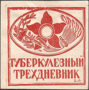 1925(?) г. Разм. 60 х 66 мм. Одноцветная печать на белой бумаге. В центре стилизованное изображение цветка мака и серпа и молота. Внизу два колоса ржи. Текст: «Туберкулезный трехдневник».