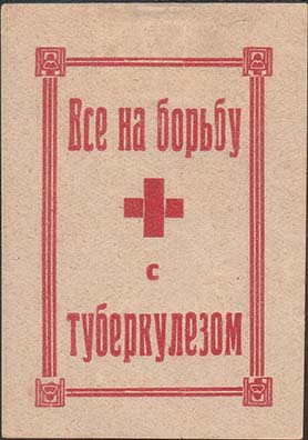 1930(?) г. Разм. рамки 34 х 51 мм. Одноцветная печать на белой бумаге. В прямоугольной рамке с декоративными элементами по углам в центре красный крест. Текст в три строки: «Все на борьбу с туберкулезом».