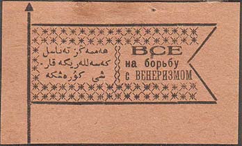 1930(?) г. Разм. 58 х 34 мм. Одноцветная печать на коричневой бумаге. В центре в рамке сложной формы в Виле флажка на фоне из декоративных элементов справа текст в три строки: «Все на борьбу с венеризмом». Слева текст в три строки на местном языке арабским шрифтом.