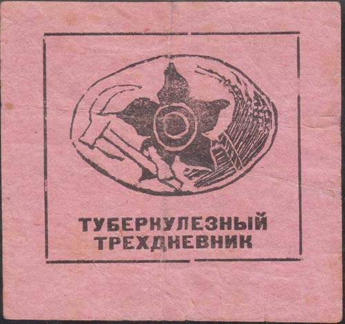 1930(?) г. Разм. 42 х 48 мм. Одноцветная печать на серо-розовой бумаге. В центре в прямоугольной рамке разм. 39 х 45 мм в центре дополнительная ромбовидная рамка. В ромбовидной рамке медицинское обозначение туберкулеза – латинские буквы «T.bc.». Ниже текст в четыре строки: «Туберк[улезный]. 3-х дневник». По внутреннему периметру наружной рамки текст: «Туберкулез болезнь пролетарская».