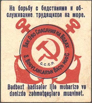 1928(?) г. Разм. 60 х 62 мм. Двухцветная печать на белой бумаге. В центре эмблема Бакинского Общества спасания на водах. Сверху текст в две строки: «На борьбу с бедствиями и обслуживание трудящихся на море». Внизу текст в две строки на азербайджанском языке латинским шрифтом.