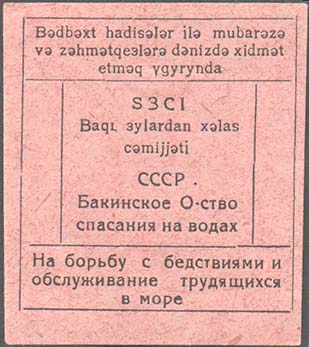 1928(?) г. Разм. 51 х 58 мм. Одноцветная печать на светло-розовой бумаге. Разм. рамки 46 х 50 мм. В центр в прямоугольной рамке разм. 33 х 28 мм текст в три строки на русском и азербайджанском языке латинским шрифтом: «СССР Бакинское О-ство спасания на водах». Снизу и сверху между рамками текст в три строки на азербайджанском языке (арабским шрифтом) и русском языках: «На борьбу с бедствиями и обслуживание трудящихся в море».