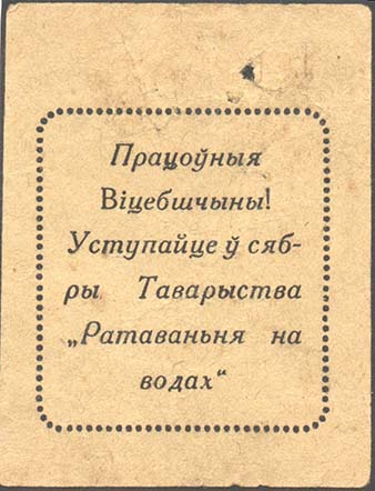 1928(?) г. Разм. 74 х 57 мм. Одноцветная печать на желтоватой бумаге. В центре в прямоугольной рамке с закругленными краями разм. 45 х 49 мм текст в шесть строк на белорусском языке: «Трудящиеся Витебщины! Вступайте в друзья общества «Спасания на водах»».