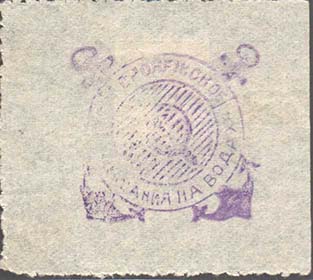1928(?) г. Разм. 52 х 47 мм. Одноцветная печать на светло-зеленой бумаге. Нерегулярная зубцовка. В центре эмблема Воронежского Общества спасания на водах.