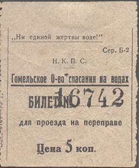 1928(?) г. Разм. 46 х 56 мм. Одноцветная печать на светло-зеленой бумаге. Одноцветная печать на серой бумаге. Нерегулярная вертикальная зубцовка. В центре текст в четыре строки: «Гомельское О-во спасания на водах. Билет №... для проезда на переправе. Цена 5 коп.». Сверху текст: «Ни единой жертвы воде! Сер. Б-2. Н.К.П.С.».