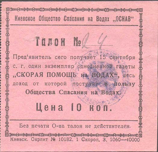 1928(?) г. Листок из квитанционной книжки разм. 90 х 85 мм. Одноцветная печать на светло-зеленой бумаге. Левосторонняя зубц. 13 1/2. В прямоугольной декоративной рамке в центре текст в семь строк: «Талон №... Предъявитель сего получает 15 сентября с. г. один экземпляр однодневной газеты «Скорая помощь на водах», весь доход от которой поступит в пользу Общества Спасания на Водах. Цена 10 коп.». Сверху текст: «Киевское Общество Спасания на Водах «ОСНАВ»». Внизу текст: «Без печати О-ва талон не действителен». Внизу под рамкой выходные данные мелким шрифтом: "Киевск. Окрлит №1082. 1 Скороп. 3. 1060-4000".