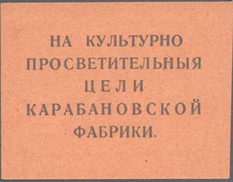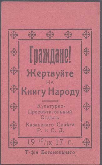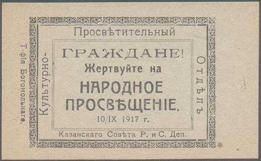 1917 г. 10.11.1917 г. Разм. 88 х 55 мм. Одноцветная печать на бумаге различных цветов. В двойной прямоугольной рамке разм. 64 х 45 мм с декоративными элементами по наружному периметру в центре текст в пять строк: «Граждане! Жертвуйте на народное просвещение 10/IX 1917 г.». По периметру между рамками текст: «Культурно-Просветительный отдел Казанского Совета Р[абочих]. и С[олдатских]. Деп[утатов].». (О).