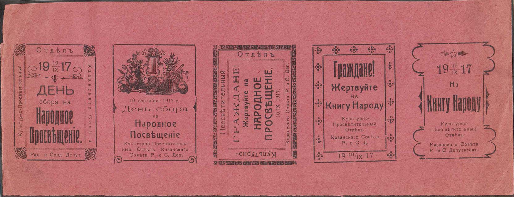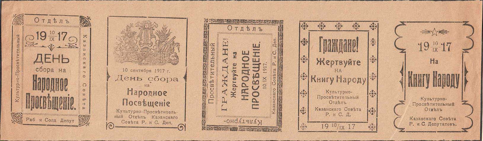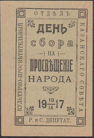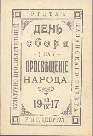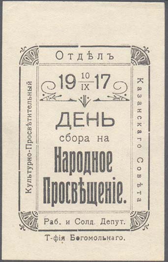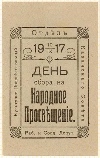 1917 г. 10.11.1917 г. Разм. 54 х 87 мм. Одноцветная печать на бумаге различных цветов. В двойной рамке с декоративными элементами по углам разм. 45 х 63 мм сверху дата: «19 10/IX 17». Внизу текст: «День сбора на Народное Просвещение». По периметру между рамками текст: «Культурно-Просветительный Отдел Казанского Совета Раб[очих]. и Солд[атских]. Депут[атов].».