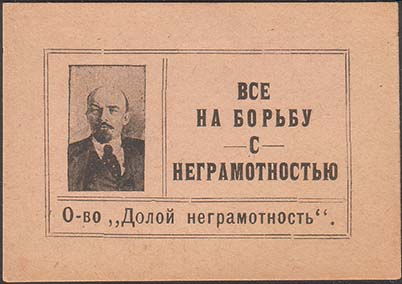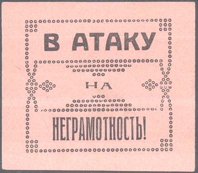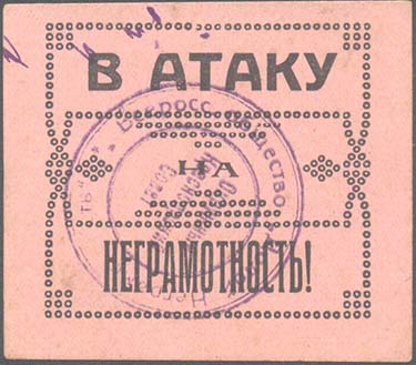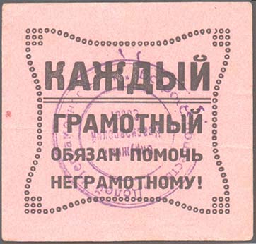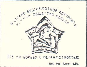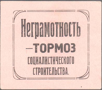 Разм. 66 х 58 мм. В центре в двойной рамке с закругленными углами разм. 50 х 45 мм текст в четыре строки: «Неграмотность – тормоз социального строительства».