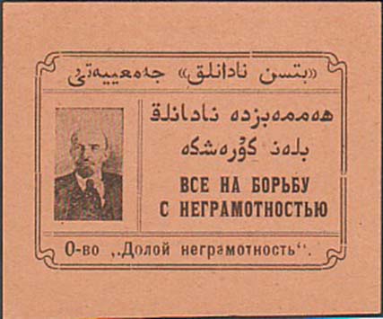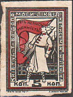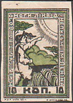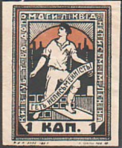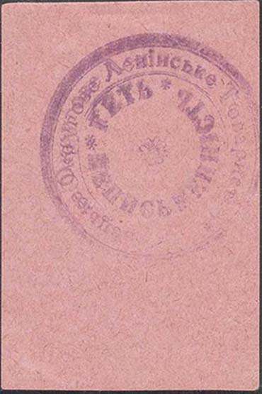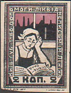1925 г. Двухцветная печать на белой бумаге. В прямоугольной декоративной рамку различные сюжеты. По внутреннему периметру рамки текст на украинском языке: «Киев[ское]. Губ[ернское]. О-во помощи ликвид[ации]. неграмотности им. Ленина». Внизу номинал. Внизу под рамкой выходные данные мелким шриф-том неразборчиво.