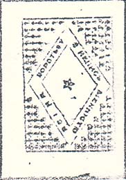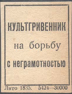 1931 г. Разм. 41 х 52 мм. Одноцветная печать на белой бумаге низкого качества. В центре в прямо-угольной рамке разм. 32 х 46,5 мм текст в три строки: «Культгривенник на борьбу с неграмотностью». Внизу под рамкой мелким шрифтом выходные данные: «Лито 1835. 5424 - 30000».
