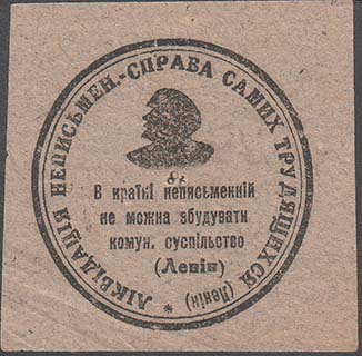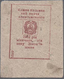 1932 г. Разм. 41 х 51 мм. Одноцветная печать на серой бумаге низкого качества. В центре в прямо-угольной рамке разм. 26 х 35 мм в центре герб УССР. Сверху текст в три строки на украинском языке: «Каждый грамотный научи неграмотного». Внизу текст в четыре строки на украинском языке: «1932 год. Месячник ликвидации неграмотности Зиновьевщины». В левом нижнем углу мелким шрифтом выходные данные вертикально снизу вверх: «1569».