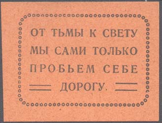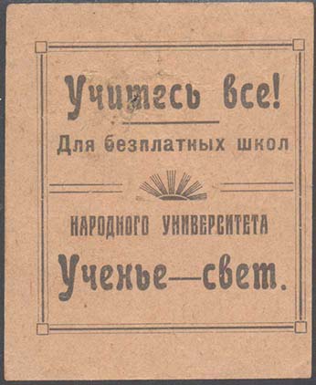 1915(?) г. Разм рамки 44 х 53,5 мм. Одноцветная печать на желтой бумаге. В тройной прямоугольной рамке с декоративными элементами по углам сверху текст в четыре строки: «Учитесь все! Для бесплатных школ Народного университета. Ученье - свет». В центре декоративный элемент и две горизонтальные линии.