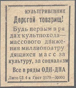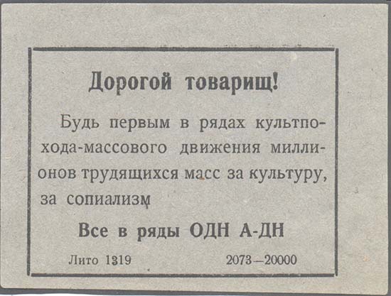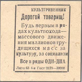 1934 г. Май. Разм. 55 х 55 мм. Одноцветная печать на бумага различных видов. В центре в прямоугольной рамке разм. 38 х 46 мм в центре текст в восемь строк: «Дорогой товарищ! Будь первым в рядах культпохода – массового движения миллионов трудящихся масс за культуру, за социализм. Все в ряды ОДН-ДНА». Сверху текст: «Культгривенник». Внизу мелким шрифтом выходные данные: «Лито 63 4-я Гост 2179-30000».