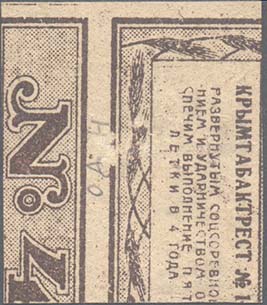 1931 г. Разм. 76 х 48 мм. Одноцветная печать на светло-зеленой бумаге. В прямоугольной рамке в центре тест в две строки: «В фонд всеобуча 5 коп.». Сверху текст: «Советская школа – школа трудящихся». Внизу текст в три строки: «В декаду всеобуча – закрепим достигнутые результаты и усилим внимание качеству учебы и политехнизации школы». Права вертикально текст: «Крымлито №1127 852 - 10000».