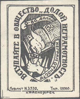 1924(?) г. Разм 43 х 54 мм. Одноцветная печать на белой бумаге. В двойной прямоугольной рамке разм. 37 х 48 мм в центре семиугольная декоративная рамка. В рамке символы знаний: рука с факелом и раскрытая книга. На ленте текст: «О-во «Долой неграмотность»». По периметру декоративной рамки текст: «Вступайте в общество «Долой неграмотность»». Внизу над рамкой мелким шрифтом выходные данные: «Гублит №3570 Тир. 10000». Внизу под рамкой мелким шрифтом текст: «Красноярск».