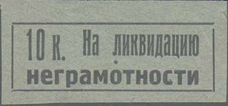 1929 г. 01.05.1929 г. Разм. рамки 50 х 17 мм. Одноцветная печать на бумаге различных цветов. В центре в прямоугольной рамке текст в две строки: «На ликвидацию неграмотности». В левом верхнем углу номинал.