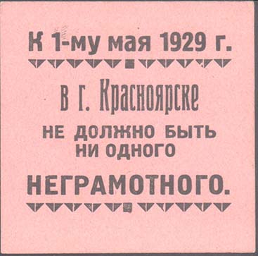 Разм. 61 х 60 мм. В центре текст в пять строк: «К 1-му мая 1929 г. в г. Красноярске не должно быть ни одного неграмотного».