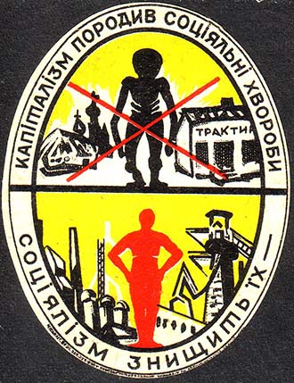 1931 г. 15.08.1931 г. Виньетка в форме овала разм. 55 х 71 мм. Трехцветная печать на белой бумаге. В двойной овальной рамке аллегорический рисунок: сверху силуэт больного человека на фоне трактира и церкви, внизу силуэт здорового человека на фоне заводов. По периметру между рамками текст на украинском языке: «Капитализм породил социальные болезни – социализм уничтожит их». Внизу под рамкой выходные данные мелким шрифтом неразборчиво.