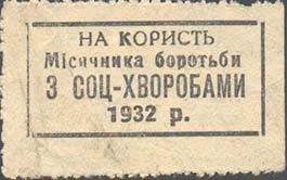 1932 г. Разм. 37 х 18 мм. Одноцветная печать на желтоватой бумаге. В прямоугольной рамке текст на украинском языке в четыре строки: «В пользу месячника борьбы с соц[иальными]-болезнями 1932 г.».