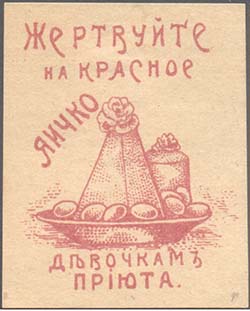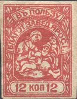 1912(?) г. 1912(?) г. Разм. Рамки 17 х 23,5 мм. Одноцветная печать на сероватой бумаге. В рамке в центре сидящая женщина и дети. Сверху полукругом текст в две строки: «В пользу благот[ворительных] завед[ений]. Ярос[лавской]. Г[убернии].». Внизу в овальной рамке номинал.