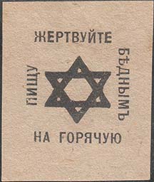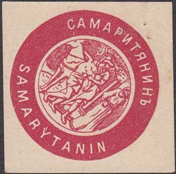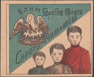 1915(?) г. Разм. рамки 50,5 х 41 мм. Трехцветная печать на плотной кремовой бумаге. Прямоугольная рамка разделена по диагонали пополам. В левом верхнем углу эмблема ВУИМ и текст в две строки: «В.У.И.М. Берегов. Приют сирот мальчиков». В правом нижнем углу трое детей.