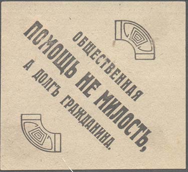 1915(?) г. Ромб разм. 84 х 84 мм. Одноцветная печать на серой бумаге. В центре текст в три строки: «Общественная помощь не милость, а долг гражданина». Сверху и снизу декоративные элементы.
