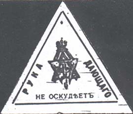 1915(?) г. Треугольник разм. 58 х 49 мм. Одноцветная печать на белой бумаге. В центре в треугольной рамке знак одного из благотворительных обществ. По внутреннему периметру рамки текст: «Рука дающего не оскудеет».