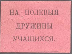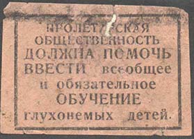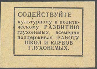 1927(?) г. Разм. 47 х 33 мм. Одноцветная печать на желто-серой бумаге. В центре в прямоугольной рамке разм. 41 х 28 мм текст в семь строк: «Пролетарская общественность должна помочь ввести всеобщее и обязательное обучение глухонемых детей».